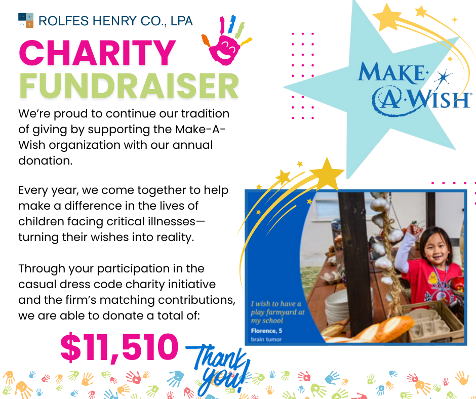 Our firm is proud to continue our tradition of giving by supporting the Make-A-Wish organization with our annual donation. Every year, we come together to help make a difference in the lives of children facing critical illnesses—turning their wishes into reality. Through your participation in the casual dress code charity initiative and the firm’s matching contributions, we can donate [...]